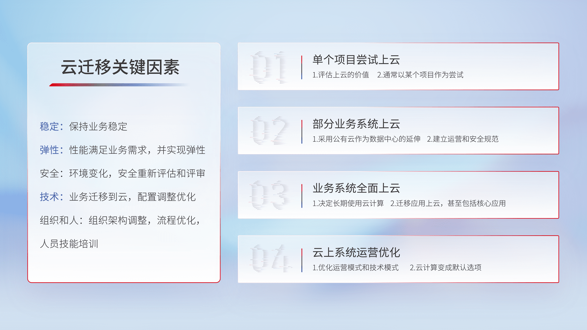 结合实际业务,,从规划设计、、、、云平台选型、、、云原生改造、、数据迁移、、、、集成交付,,,,迁移全过程为客户识别最佳上云路径,,,,做好风险识别管理,,,设计网络架构、、、身份权限、、、安全审计合规、、、操作审计、、日志审计、、监控告警策略、、多站点容灾设计等,,,,对云上基础设施进行整体规划,,,提升IT治理水平,,,,以满足弹性、、高可用、、高性能的需求。。。