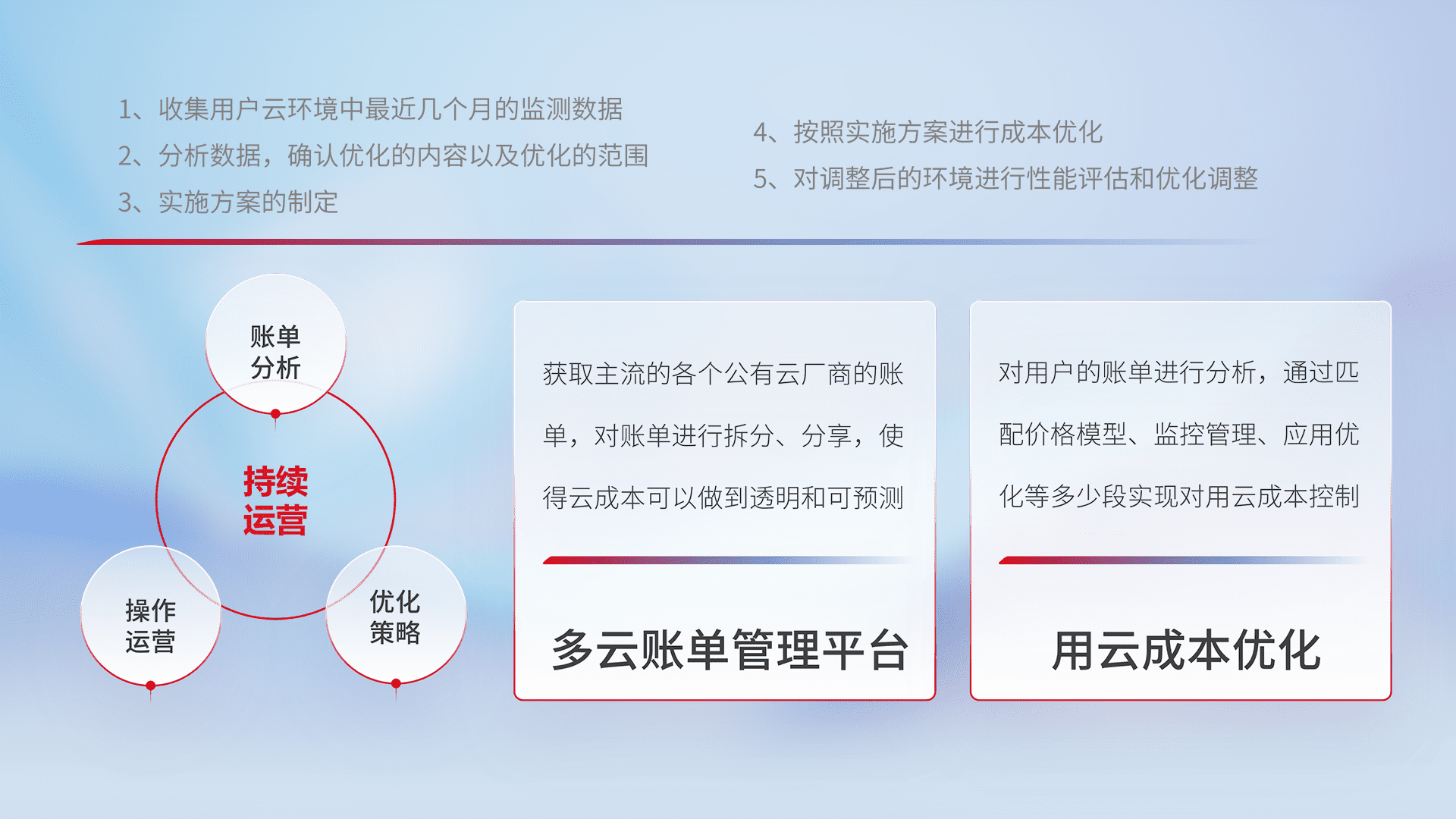 通过多云纳管,,,,以统一的资源数据模型把客户的云资源进行抽象和封装,,进而实现对多云资源的统一操作,,保障云资源管理的可靠性、、稳定性与可用性。。。。量身定制化运维内容,,,配置、、、开发运维、、补丁管理、、、备份、、、、监控、、认证和访问管理、、审计和日常巡检等,,保障在用云过程中的可靠度,,,,稳定度以及高可用率。。。。